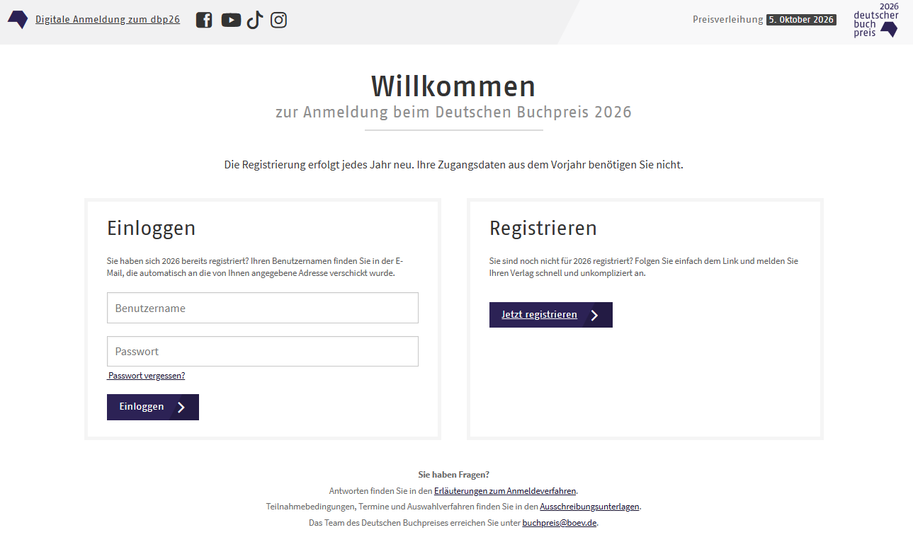 Sollten Sie technische Probleme haben oder Fragen, die durch diese Einleitung und die Ausschreibungsunterlagen des Deutschen Buchpreises nicht beantwortet werden, wenden Sie sich bitte an buchpreis@boev.de oder +49 69 1306-342.