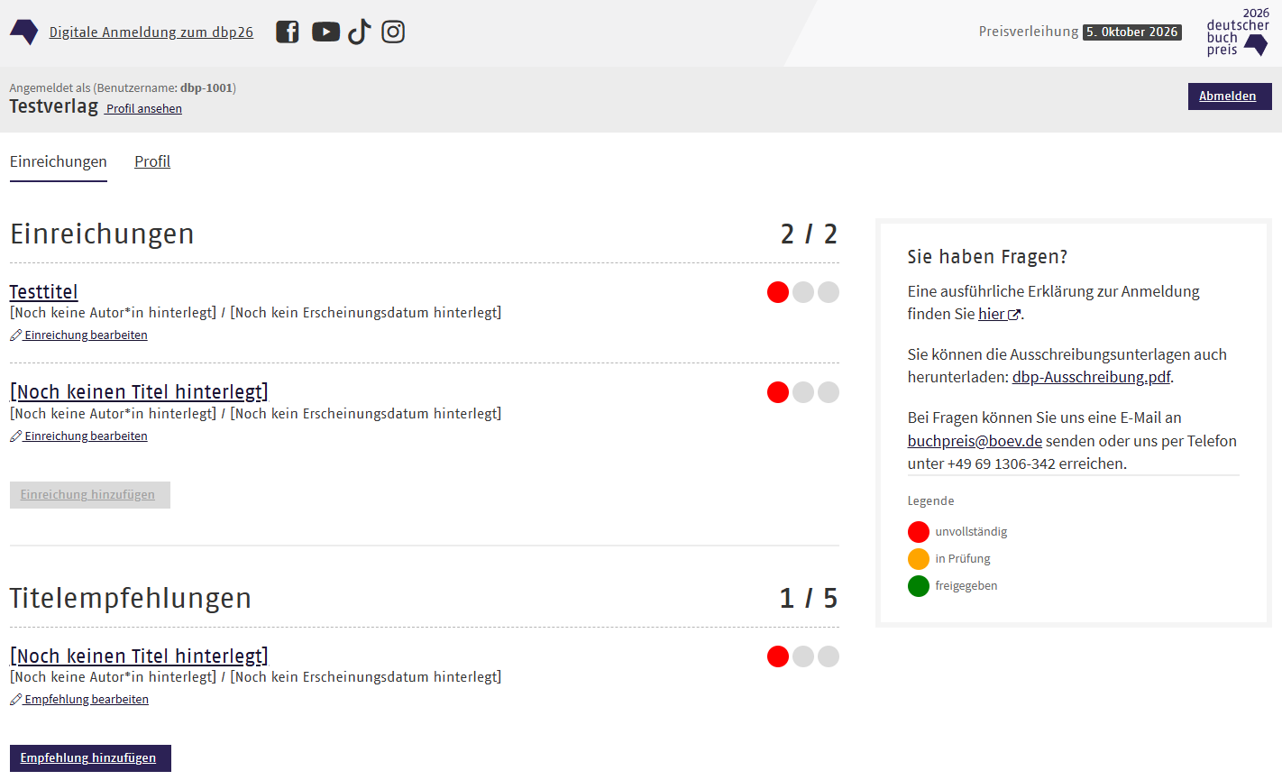 Über "Einreichung hinzufügen" gelangen Sie zur Eingabemaske für Ihre einzelnen Titel. Sie können bis zu zwei Titel aus Ihrem aktuellen Programm für den Deutschen Buchpreis einreichen. Die Kriterien dazu entnehmen Sie bitte der Ausschreibung für den Deutschen Buchpreis 2026.