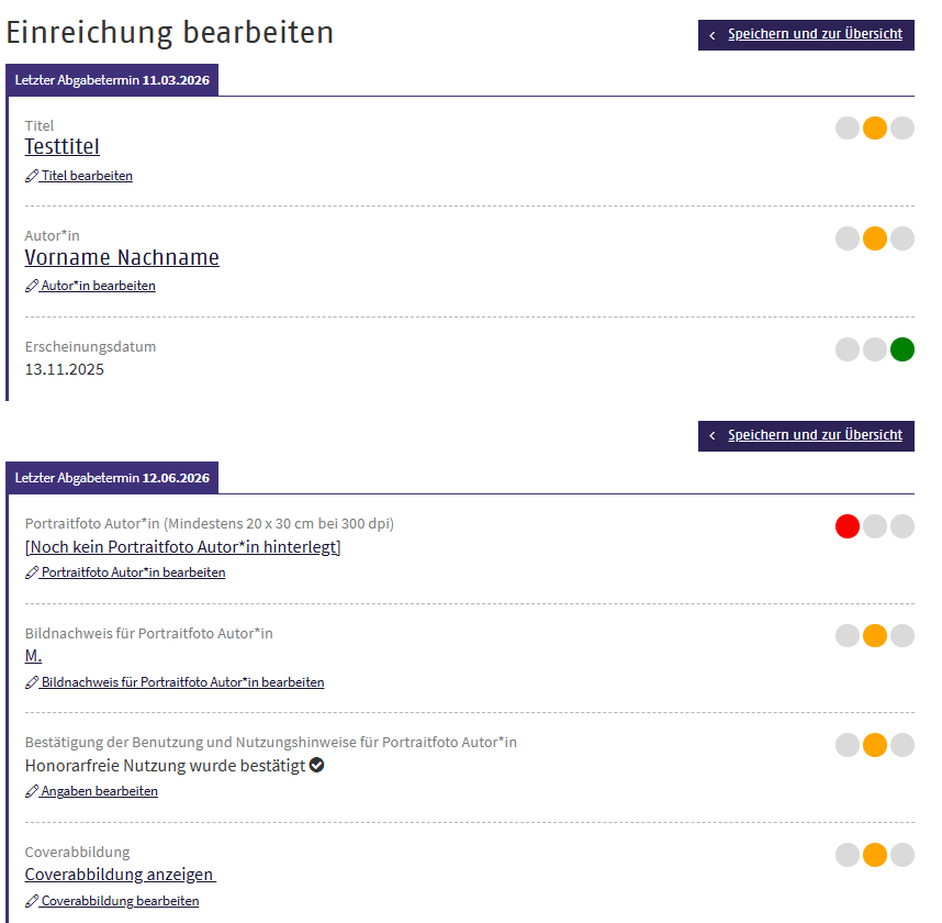 Wenn Sie alle Felder ausgefüllt und alle benötigten Dateien hochgeladen haben, ist Ihre Einreichung fertig. Die Ampeln stehen überall auf gelb. Sie können sich abmelden. Ihre Anmeldung wird im nächsten Schritt vom Team des Deutschen Buchpreises geprüft und in der Regel bestätigt. Die Ampeln werden dann auf grün gesetzt. Sie können nun an den eingegebenen Inhalten keine Änderung mehr vornehmen.