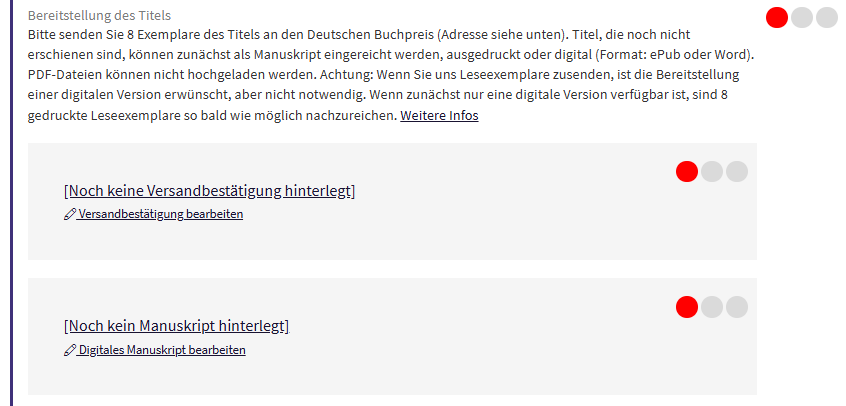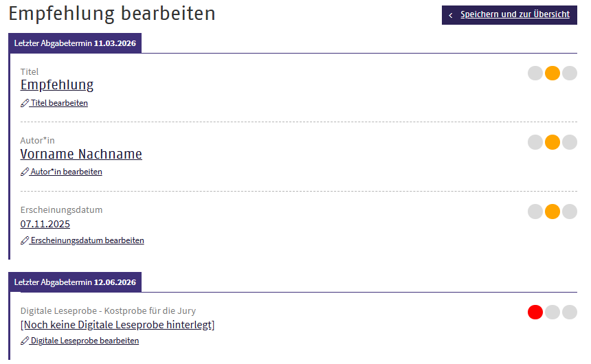 Sollte es mit einzelnen Daten Probleme geben, wird sich das Team des Deutschen Buchpreises mit Ihnen in Verbindung setzen. Die Ampeln der entsprechenden Eingaben werden wieder auf rot gestellt und wir bitten Sie, Ihre Eingaben entsprechend zu ändern.